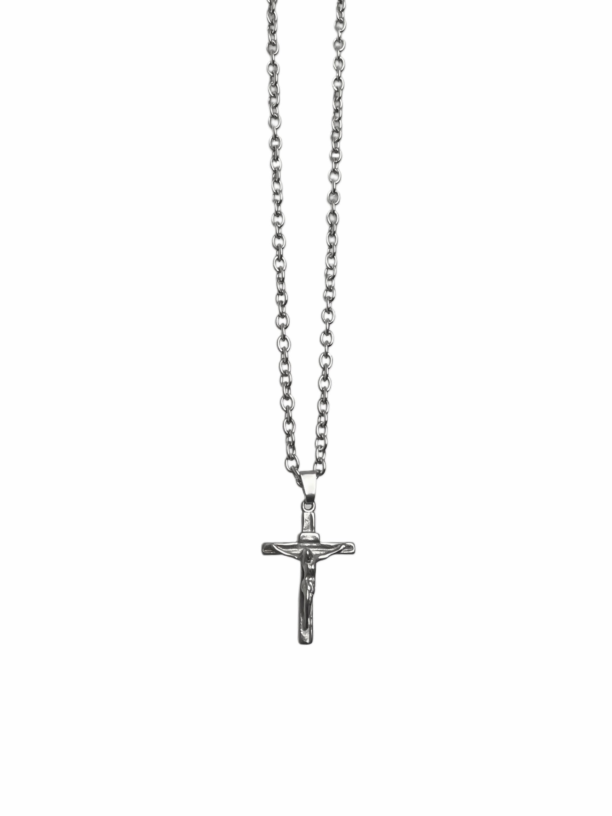 Cruz de acero inoxidable con un largo de 2,5 cm por 1,9 cm de ancho.